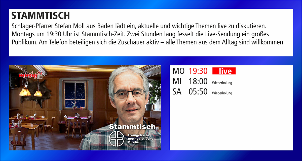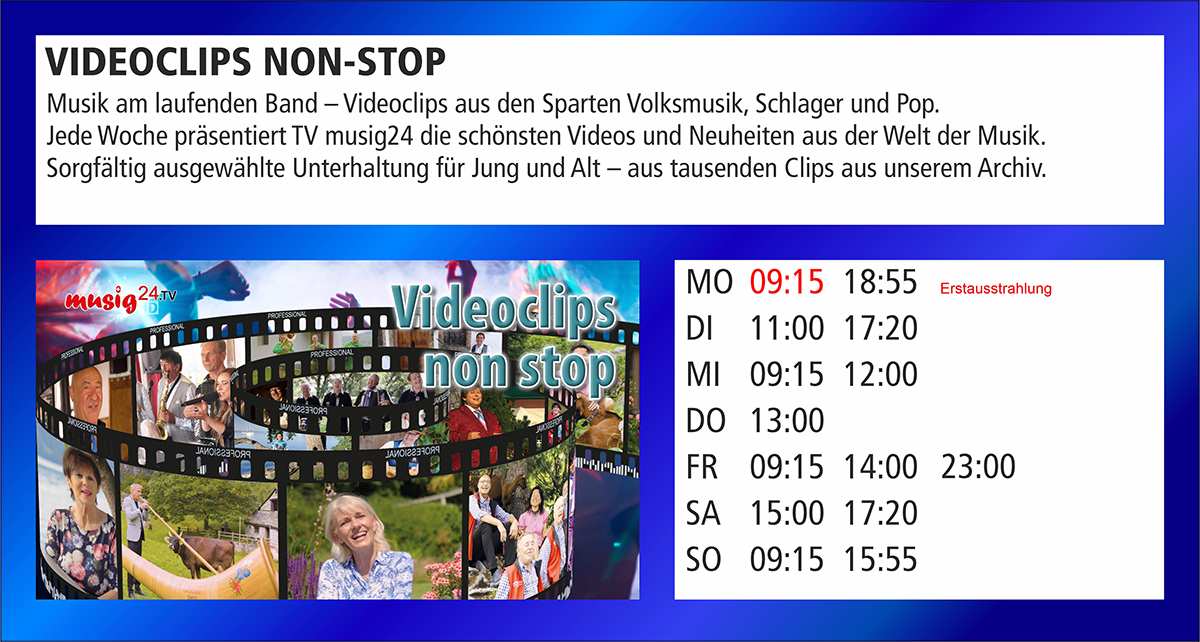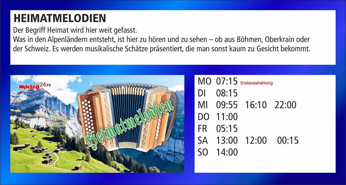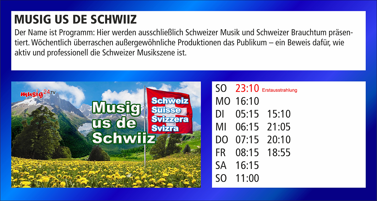 "musig24" ist bestrebt nicht nur Neues, sondern auch musikalische Leckerbissen der vergangenen Jahre zu präsentieren. Viel Musik, kurzweilige Interviews, neues aus der Musikwelt und Informationen und Hintergrundinformationen zu Veranstaltungen sind feste Bestandteile unseres Programms
